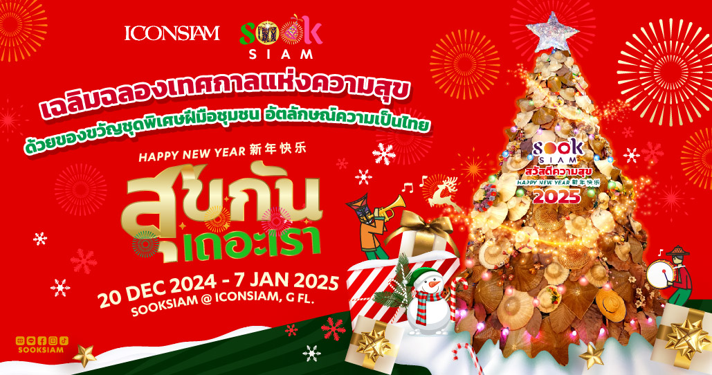 20 ธันวาคม 2567 - 7 มกราคม 2568มาเติมความสุขในเทศกาลปีใหม่นี้ที่เมืองสุขสยาม ณ ไอคอนสยาม พบกับบรรยากาศสุดอบอุ่นพร้อมมุมถ่ายรูปสุดสร้างสรรค์! ตื่นตาตื่นใจกับ ต้นคริสต์มาสจากหมวกงอบ ที่สะท้อนเอกลักษณ์ความเป็นไทยอย่างลงตัว มุมสุดชิค! ต้นคริสต์มาสจาก #หมวกงอบ ที่สะท้อนอัตลักษณ์ภูมิปัญญาไทยอย่างงดงาม ที่รังสรรค์จากวัสดุธรรมชาติ เช่น ใบลาน ใบจาก และไม้ไผ่ ในรูปแบบที่หลากหลาย และมีความสวยงามที่แตกต่างกัน เช่น หมวกงอบใบลานโบราณที่มักใช้ในแถบภาคกลาง หมวกทรงสามล้อ หมวกทรงกระทะคว่ำโบราณ ฯลฯ บ่งบอกถึงวิถีชีวิตเรียบง่ายของเกษตรกรไทยและประเทศเพื่อนบ้านในเอเชียตะวันออกเฉียงใต้ และจะมีหมวกทรงต่าง ๆ ที่สะท้อนภูมิปัญญาไทยอย่างมีเอกลักษณ์ มาจำหน่ายในช่วงปีใหม่ที่เมืองสุขสยามอีกด้วย ช็อปของขวัญสุดพิเศษฝีมือชุมชนไทย อิ่มอร่อยกับสตรีทฟู้ดไทย จากทุกภูมิภาคของไทย เพลินไปกับการแสดงศิลปวัฒนธรรมไทย สุดงดงาม พบกันที่งาน 'SOOKSIAM สุขกันเถอะเรา' พร้อมให้คุณมาเก็บความประทับใจในช่วงเวลาพิเศษนี้! 20 ธ.ค 67 - 7 ม.ค. 68 เมืองสุขสยาม ณ ไอคอนสยาม ชั้น G