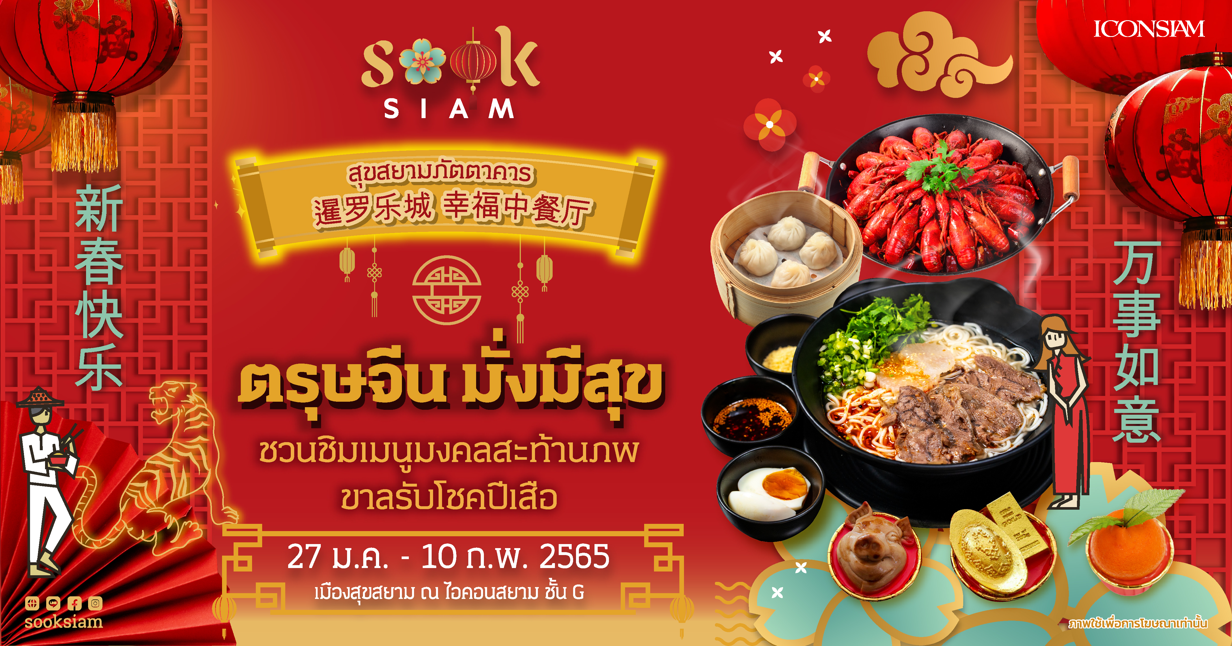 27 มกราคม 2565 - 10 กุมภาพันธ์ 2565หัวใจของเทศกาลตรุษจีน คือ ครอบครัว #ตรุษจีนมั่งมีสุข นำความสุขกลับมาเติมเต็มให้ทุกคนในครอบครัวอีกครั้ง ต้อนรับเทศกาลตรุษจีนปี 2565 กับงาน "ตรุษจีน มั่งมีสุข" จ่าย ไหว้ เที่ยว ที่เดียวสุขได้ทั้งครอบครัว พร้อมไฮไลท์เมนูพิเศษจากต้นตำรับ ให้สุดยอดนักชิมได้มาตามรอยความอร่อย ด้วยการเนรมิตพื้นที่เมืองสุขสยามให้เป็น “สุขสยามภัตตาคาร” ภายใต้ชื่อว่า.. ชิ่งฝูจงชานทิง แปลว่า ร้านอาหารจีนที่มีความสุข ระหว่างวันที่ 27 มกราคม - 10 กุมภาพันธ์ 2565 เมืองสุขสยาม ณ ไอคอนสยาม ชั้น G พร้อมให้บริการภายใต้มาตรการความสะอาดด้านสุขอนามัยและความปลอดภัยสูงสุด สุขสมหวัง ตรุษจีนมั่งมีสุข รับปีเสือทอง พรั่งพร้อมของกิน ของใช้ เสื้อผ้า ของที่ระลึก พร้อมของไหว้ ของมงคล อาหารจีน จากร้านค้าชื่อดังมากมาย พิเศษ!! #สุขสยามชิ่งฟูจงทานชิง #ภัตตาคารแห่งความสุข นำเสนอเมนูอร่อยจากร้านอาหารจีน #เมนูมงคลสะท้านภพ "ขาลรับโชคปีเสือ" ส่งตรงเมนูมงคลแสนอร่อย จาก 5 มณฑลประเทศจีน ที่คุณต้องมาลิ้มลองเพื่อความเป็นสิริมงคล หลานโจวราเมน อาหารรสดีเมืองหลานโจว มณฑลกานซู ก๋วยเตี๋ยวเนื้อแพะกุ้ยโจ ขนมปิงเฟิ่น,กุ้งมังกรพะโล้ว อาหารและขนมที่มีชื่อเสียง จากมณฑลกุ้ยโจว ซาลาเปาโก่วปู้หลี่เทียนจิน ซาลาเปาไส้หมูทอด ร้านอาหารซัวเถา มณฑลกุ้ยโจว เซี่ยงไฮ้เสี่ยวหลงเปา จากมณฑลเซี่ยงไฮ้ ลูกชิ้นเนื้อวัวซัวเถา จากมณฑลกวางตุ้งซัวเถา พร้อมเมนูอาหารจีนอีกมากมาย อาทิ เมนูเตี๋ยวยัดไส้ (กุยช่าย, หน่อไม้, กะหล่ำปลี, ข้าวโพด), ขาไก่ฮ่องเต้ ร้านครัวแต๋จิ๋ว, ขนมเปี๊ยะ สูตรต้นตำรับ ขนมหวานเมนูวุ้นชุดมงคล ที่บรรจงประดิษฐ์วุ้นกะทิ เป็นเมนูอาหารมงคลต่างๆ อาทิ ก้อนทอง หมู เห็ด เป็ด ไก่ ส้มมงคล จากร้านน้ำใจ พร้อมตื่นตาตื่นใจกับการแสดงเชิดสิงโต, เชิดมังกร เพิ่มความมั่งคั่ง มั่งมี และเป็นสิริมงคลรับเทศกาลปีใหม่จีน สักการะเทพเจ้า #ไฉ่ซิ่งเอี่ย เป็นเทพเจ้าที่คนจีน เชื่อกันว่าช่วยประทานพร เกี่ยวกับโชคลาภ และความร่ำรวย ที่จะให้โชคลาภด้านเงินทอง รวมถึงช่วยให้สุขภาพแข็งแรง และ ความสามัคคีรักใคร่ปรองดองกันในครอบครัวอีกด้วย #บริเวณศาลาแสนสุข เมืองสุขสยาม