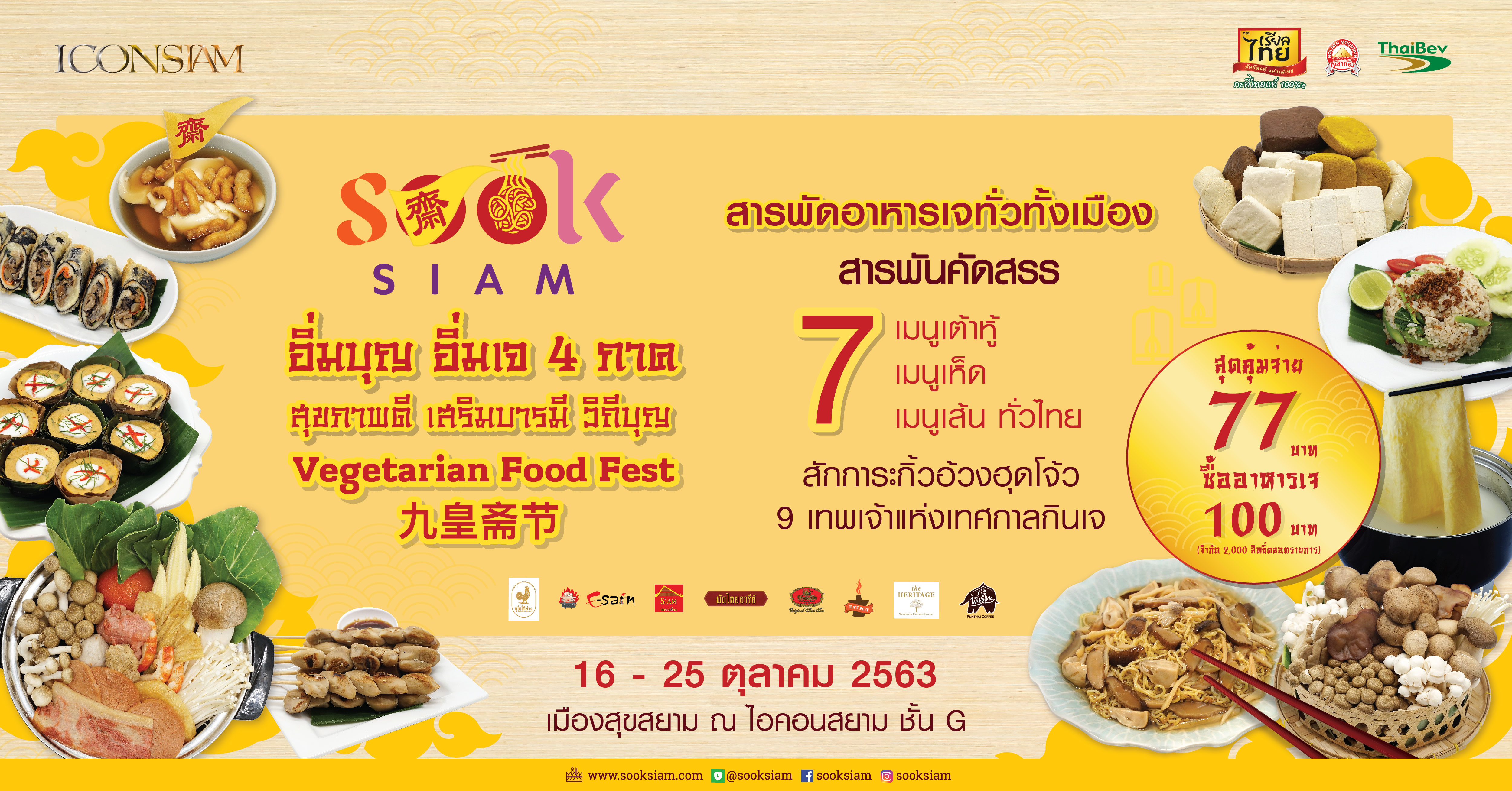 26 กันยายน 2562 - 7 ตุลาคม 2562เมืองสุขสยาม ณ ไอคอนสยาม ร่วมมือกับ การท่องเที่ยวแห่งประเทศไทย (ททท.) และพันธมิตรทางธุรกิจอย่างแบรนด์ "กะทิเรียลไทย กะทิไทยแท้100%" จัดงานเทศกาลมหากุศล “อิ่มบุญ อิ่มเจ 4 ภาค” สุดยิ่งใหญ่ ร่วมสักการะขอพรเจ้าแม่กวนอิม เสริมสิริมงคล, พร้อมยกขบวนร้านอาหารเจในตำนานกว่า 100 เมนู มาให้ลิ้มรสภายในงาน โดยได้รวบรวมเมนูพิเศษจาก 4 ภาค และร้านดังมาให้ลิ้มลองแบบถึงแก่นต้นตำรับ ได้แก่ ภาคกลางและร้านอร่อยย่านฝั่งธนบุรีและเจริญนคร นำโดยร้านดัง อาทิ ป๋าป้า เตี้ยมซิม กุ่ยช่ายตลาดพลู, ข้าวต้มแปลงนาม 24 น., เมนูเจขึ้นชื่อจากครัวเจ๊ง้อ ภาคเหนือ : ขนมเส้นเจียงฮาย เต็มอิ่ม จ.ลำปาง, ข้าวซอยลำดวนฟ้าฮ่าม จ.เชียงใหม่ ภาคอีสาน : อาหารอีสานรสจัดจ้าน ส้มตำปลาร้าเจ แกงอ่อมเจ จากมาเด้อหล่า by ร้านภูไทไก่ย่าง 1971 ภาคใต้ : ไอศกรีมพันล้าน ไอศกรีมใบเหลียง ไอศกรีมส้มจี๊ด ไอศกรีมโฮมเมดสไตล์ผลไม้ไทย อ.ทุ่งตะโก จ.ชุมพร นอกจากนี้ยังมีวัตถุดิบเจชั้นเลิศมาให้เลือกช้อปฯ กันอย่างจุใจ อาทิ ผักและผลไม้จากสวนผักไร้สารบ้านต่าย หมู่บ้านห้วยพลู อ.บางเลน จ. นครปฐม ข้าวโพดหวานไร่สุวรรณ อ.ปากช่อง จ.นครราชสีมา ซีอิ๊วตรารถยนต์ และ หมี่สั่วตรานกนางแอ่น จ.ภูเก็ต เต้าหู้เหลืองสูตรดั้งเดิม ชาวปกาเกอะญอแห่งชุมชนพระบาทห้วยต้ม หมู่บ้านมังสวิรัติแห่งเดียวในประเทศไทย ที่ อ.ลี้ จ.ลำพูน #สุขสืบสาน กับเทศกาลเจ ในงาน “อิ่มบุญ อิ่มเจ 4 ภาค” ชวนลิ้มรสอาหารเจกว่า 50 ร้าน 100 เมนูจานเด็ด คัดสรรร้านอาหารเจชื่อดังในตำนานทั้ง 4 ภาค มาไว้ที่ลานเมืองชั้น G เมืองสุขสยาม ณ ไอคอนสยาม ระหว่างวันที่ 26 กันยายน - 7 ตุลาคมนี้ สอบถามรายละเอียด โทร. 02-658-1000 Facebook : SOOKSIAM @Line : SOOKSIAM