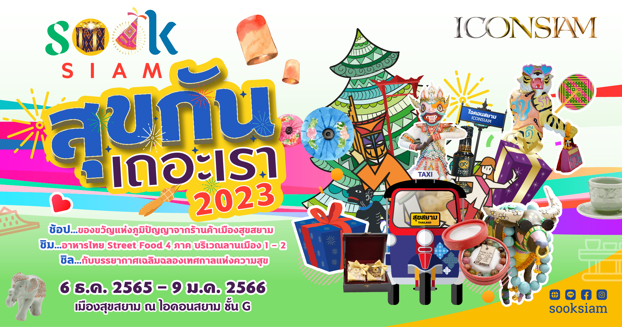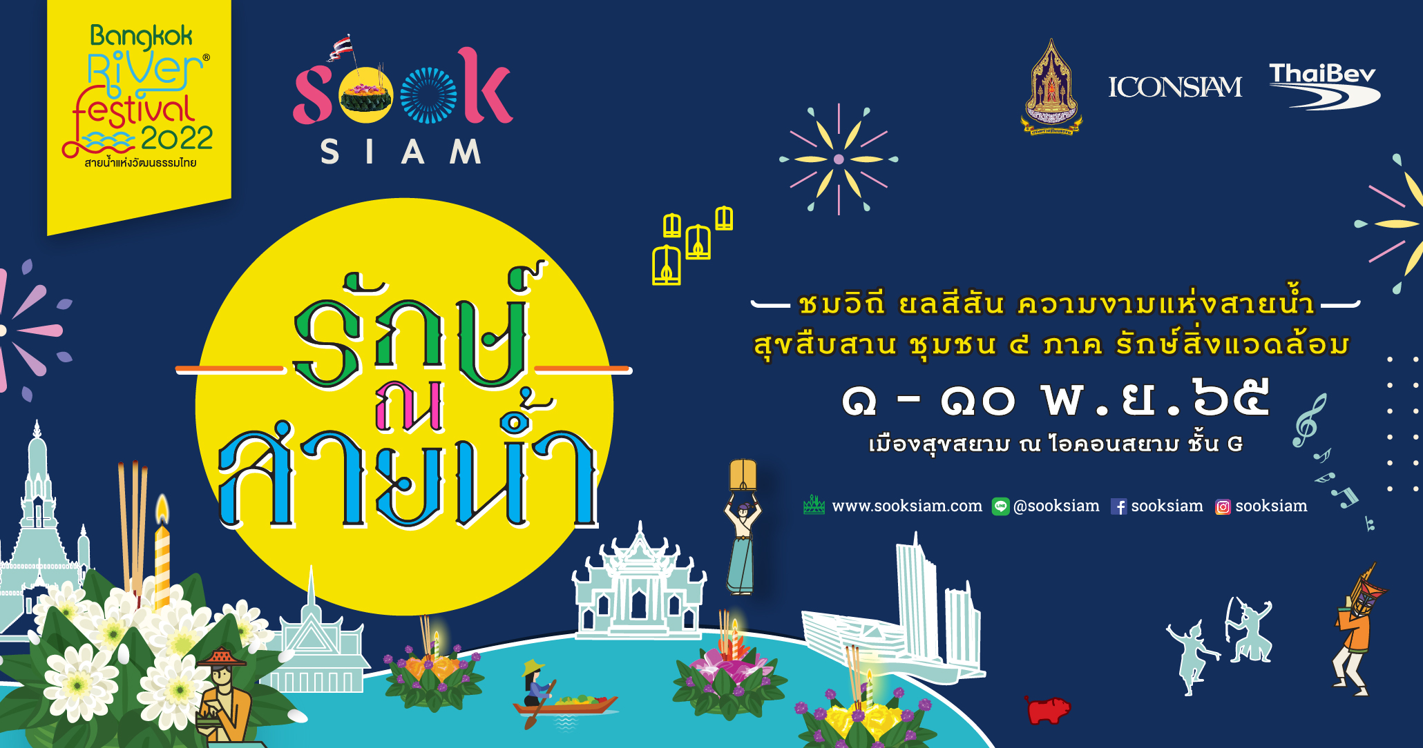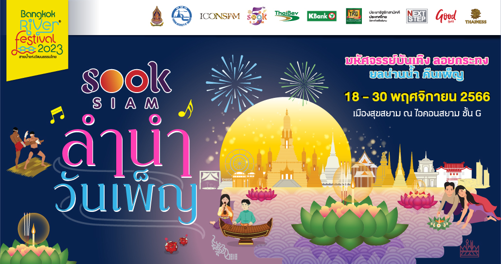 18 พฤศจิกายน 2566 - 30 พฤศจิกายน 2566เมืองสุขสยาม ณ ไอคอนสยาม ร่วมมือกับกระทรวงวัฒนธรรม การท่องเที่ยวแห่งประเทศไทย (ททท.) บริษัทไทยเบฟเวอเรจ จำกัด (มหาชน) Bangkok River Festival 2023 ธนาคารกสิกรไทย จำกัด (มหาชน) บริษัท ไทย อกริ ฟู้ดส์ จำกัด (มหาชน) บริษัท เนกซ์เสตป จำกัด และบริษัท ประชารัฐรักสามัคคี วิสาหกิจเพื่อสังคม (ประเทศไทย) จํากัด สืบสานประเพณีลอยกระทงของไทย จัดงาน “SOOKSIAM ลำนำ วันเพ็ญ” ชมมหัศจรรย์ความบันเทิง ลำนำบทเพลงคลอเคล้าทำนอง ยลน่านน้ำในคืนเพ็ญ .