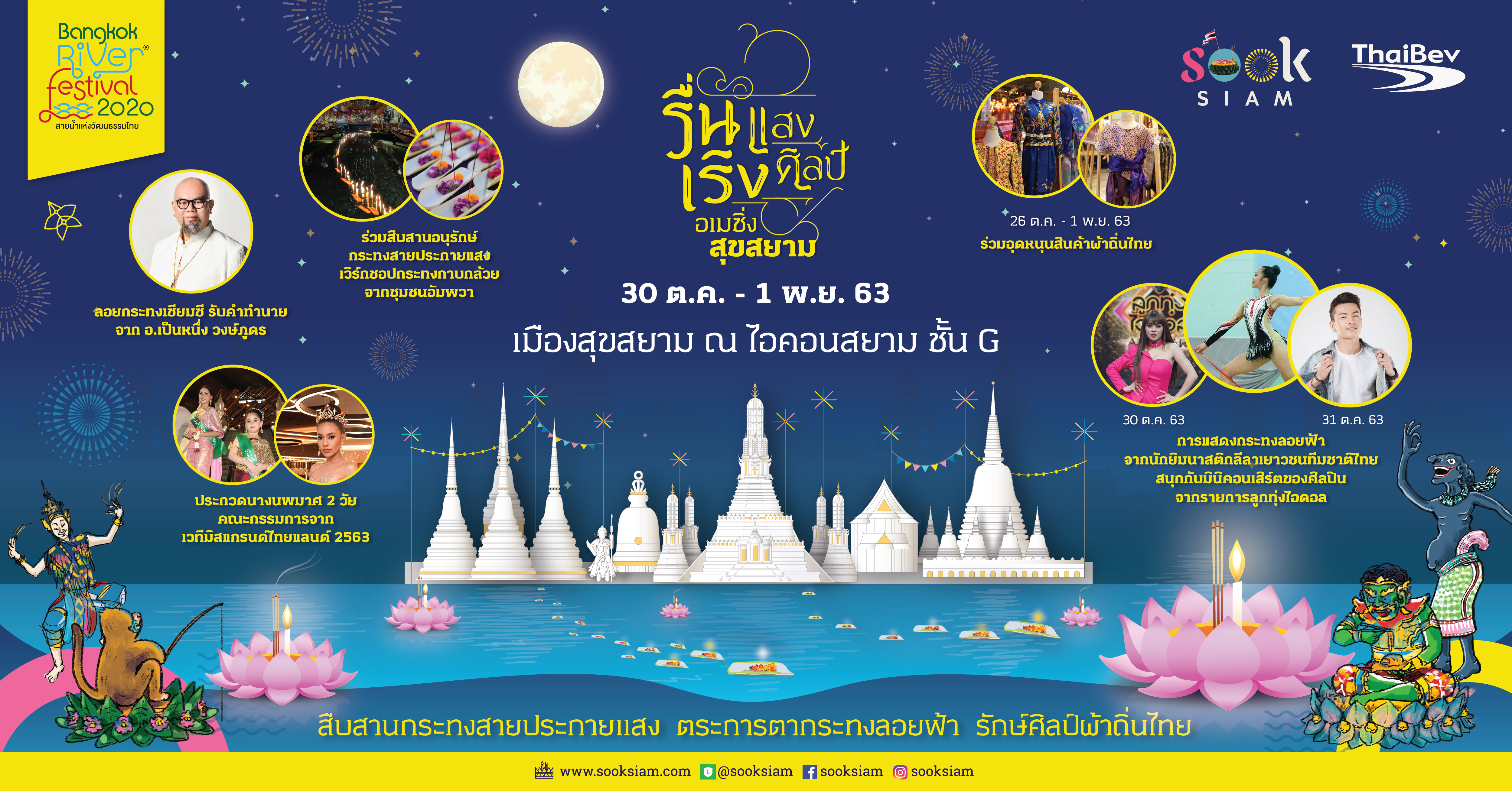 30 ตุลาคม 2563 - 1 พฤศจิกายน 2563ร่วมสืบสานประเพณีอันดีงาม และอนุรักษ์วัฒนธรรมแห่งสายน้ำเจ้าพระยา ในงาน “รื่นเริง แสงศิลป์ อเมซิ่ง สุขสยาม” ที่เมืองสุขสยาม ณ ไอคอนสยาม ชั้น G วันที่ 30 ตุลาคม – 1 พฤศจิกายน 2563 #สุขสนุก กับกิจกรรมมากมาย เพื่อมอบรอยยิ้ม และประสบการณ์สารพัดสุข สนุกแบบไทย ผ่านนานาความบันเทิง #สุขสืบสาน กับการอนุรักษ์กระทงสายประกายแสง ที่นำกระทงกาบกล้วยมาร้อยเรียงกันเป็นแนวยาว พร้อมประกายแสงแห่งความสวยงามสว่างไสว บริเวณสายน้ำโซนภาคกลาง #สุขสร้างสรรค์ ร่วมเวิร์กชอปกระทงกาบกล้วยจากชุมชนอัมพวา จ.สมุทรสงคราม ที่ใช้วัสดุอันเป็นมิตรกับสิ่งแวดล้อม อย่างกาบกล้วยและดอกไม้มาประดิษฐ์ เพื่อสืบสานเอกลักษณ์แห่งชุมชนให้คงอยู่อย่างสร้างสรรค์สวยงาม #สุขสนุก ตระการตากับการแสดงกระทงลอยฟ้า มหัศจรรย์แห่งวิจิตรศิลป์และนวัตกรรมความงดงามของ “กระทง 4 ภาค” ที่รังสรรค์โดย ประติมากรรุ่นใหม่ คุณเอกลักษณ์ สระแก้ว ผสมผสานกับการแสดงจากนักยิมนาสติกลีลา เยาวชนทีมชาติไทย #สุขสมหวัง กับกระทงเซียมซี ดวงดีดั่งตั้งใจ กับการลอยกระทงเทียนหอมสีสันสวยงาม 7 สีตามวันเกิด พร้อมรับคำทำนายจากสายน้ำโดย อ.เป็นหนึ่ง วงษ์ภูดร ซินแสคนดังแห่งยุค บริเวณสายน้ำโซนภาคใต้ #สุขสัมพันธ์ กับการประกวดนางนพมาศ 2 วัย (คู่แม่ - ลูก หรือ คู่ยายหรือย่า - หลาน) ชิงเงินรางวัลพร้อมสายสะพาย ให้คุณสานสายใยในครอบครัว ด้วยการทำกิจกรรมอนุรักษ์วัฒนธรรมประเพณีไทยร่วมกัน #สุขเสน่ห์ รักษ์ศิลป์ ผ้าถิ่นไทย ร่วมอุดหนุนผ้าไทย ทั้งผ้าไหม ผ้าฝ้าย ผ้าทอมือ ที่เป็นหัตถศิลป์จากชุมชนจาก 4 ภาคทั่วไทย พร้อมเครื่องประดับจากช่างฝีมือเยี่ยม ให้คุณเลือกซื้อพร้อมสวมใส่ เพื่ออนุรักษ์มรดกบนผืนผ้าอันสวยงามของไทยให้คงอยู่ (วันที่ 26 ต.ค. - 1 พ.ย. 63) พร้อมชมการแสดงมินิคอนเสิร์ตศิลปินลูกทุ่งจากเวทีลูกทุ่งไอดอล และการแสดงดนตรีจากเยาวชน ที่ร่วมสร้างความบันเทิงให้คุณตลอดงาน วันศุกร์ที่ 30 ตุลาคม 63 พบกับ แอมมี่ ศิริลักษณ์ สาวลูกทุ่งลีลาครบเครื่องทั้งร้อง ทั้งเต้น วันเสาร์ที่ 31 ตุลาคม 63 พบกับ เขตต์ ศิรสิทธิ์ หนุ่มลูกทุ่งเสียงเสน่ห์ ขวัญใจแฟนคลับ ลอยกระทงปีนี้ มาร่วมสัมผัสประสบการณ์สารพัดสุข สนุกแบบไทยแบบครบรสในที่เดียว ที่เมืองสุขสยาม ณ ไอคอนสยาม ชั้น G