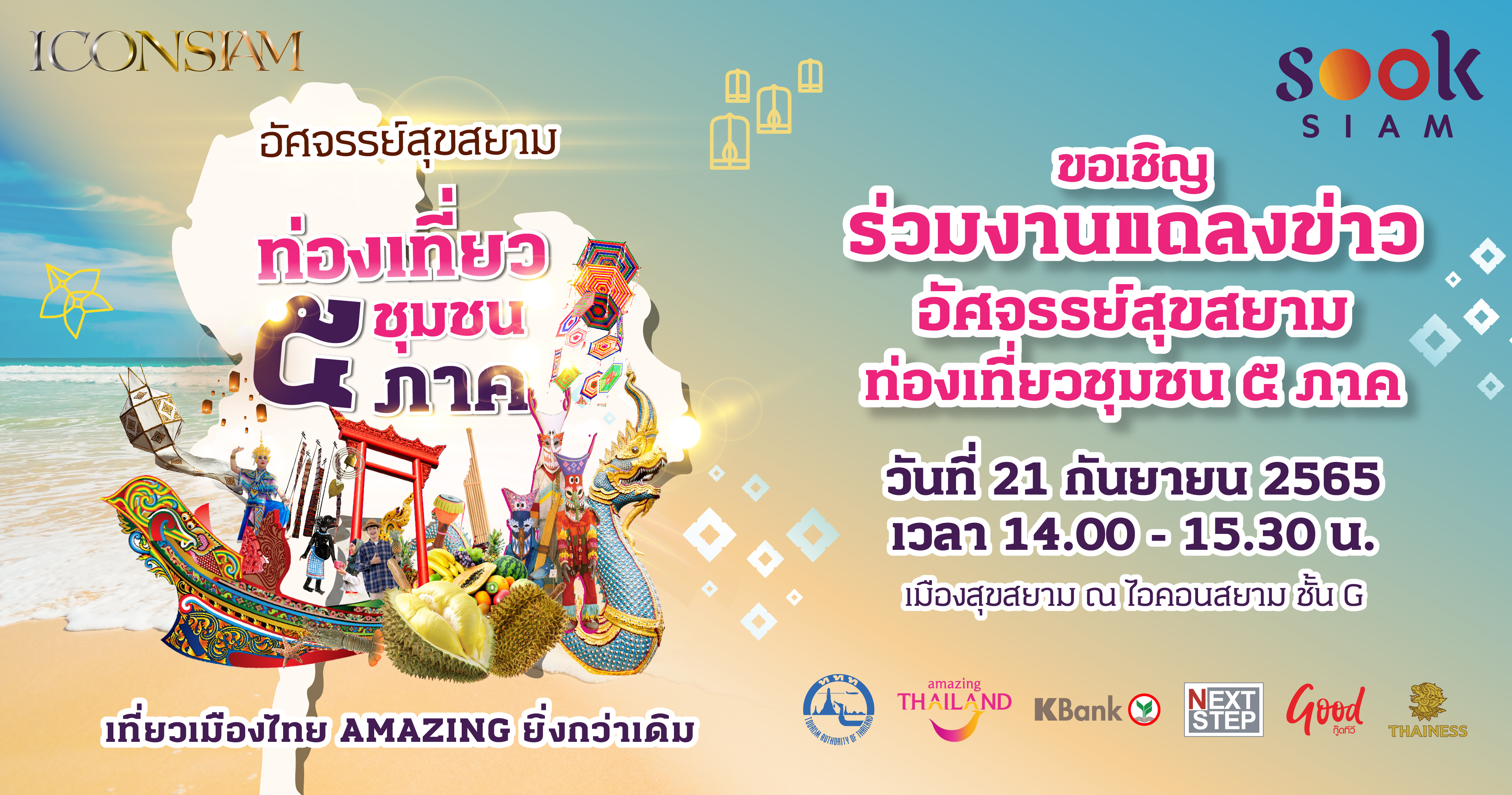 21 กันยายน 2565 - 21 กันยายน 2565#สุขสยาม ร่วมกับ #การท่องเที่ยวแห่งประเทศไทย และ #ธนาคารกสิกรไทย จํากัด (มหาชน) ขอเชิญร่วมงานแถลงข่าว เปิดตัว งาน อัศจรรย์สุขสยาม ท่องเที่ยวชุมชน 5 ภาค #มหกรรมแหล่งท่องเที่ยว ตะวันออก เหนือ อีสาน กลาง ใต้ จัดเต็มความสุข ชวนกินปู ดูทะเล สัมผัสมนต์เสน่ห์เมืองใต้ ชิมช้อปตลาดชุมชน ชมการแสดงท้องถิ่น สักการะสิ่งศักดิ์สิทธิ์ประจำภาค ไหว้พระธาตุ ตามรอยอารยธรรม “เที่ยวเมืองไทย Amazing ยิ่งกว่าเดิม” วันที่ 21 กันยายน 2565 ตั้งแต่เวลา 14:00-15:30 น. เป็นต้นไป เมืองสุขสยาม ณ ไอคอนสยาม ชั้น G #อัศจรรย์สุขสยามท่องเที่ยวชุมชน5ภาค #เที่ยวเมืองไทยAmazingยิ่งกว่าเดิม #การท่องเที่ยวแห่งประเทศไทย #ธนาคารกสิกรไทย #เมืองสารพัดสุขสนุกแบบไทย #สุขสยาม #ไอคอนสยาม #SOOKSIAM #ICONSIAM