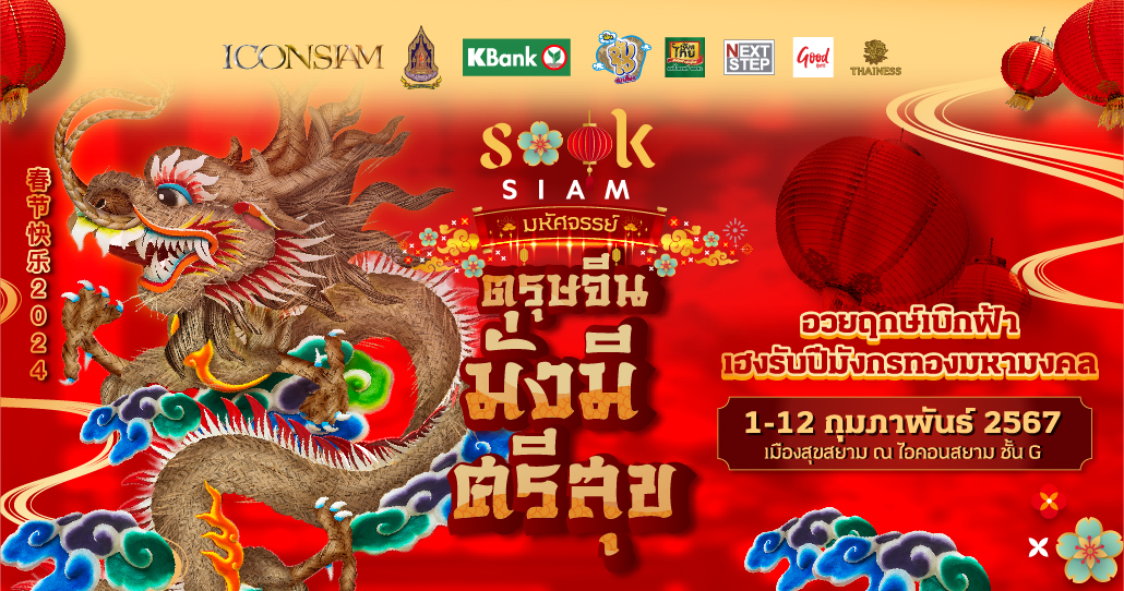 1 กุมภาพันธ์ 2567 - 12 กุมภาพันธ์ 2567ซินเจียยู่อี่ซินนี่ฮวดไช้ ฉลองตรุษจีนสุดยิ่งใหญ่ ต้องรับปีมังกร ให้ปัง ให้เฮง เมืองสุขสยาม ณ ไอคอนสยาม ร่วมกับพันธมิตร กระทรวงวัฒนธรรม ธนาคารกสิกรไทย จำกัด (มหาชน) บริษัท โออิชิ เทรดดิ้ง จำกัด ผู้ผลิตและจัดจำหน่าย เครื่องดื่มสมุนไพรจับเลี้ยงแบรนด์ จับใจ บริษัท ไทย อกริ ฟู้ดส์ จํากัด (มหาชน) กะทิเรียลไทย และบริษัท เนกซ์สเตป จำกัด ร่วมกันจัดงาน “สุขสยาม มหัศจรรย์ ตรุษจีน มั่งมีศรีสุข” อวยฤกษ์เบิกฟ้า เฮงรับปีมังกรทองมหามงคล . กราบไหว้สักการะขอพรสิ่งศักดิ์สิทธิ์ เทพเจ้ามังกรเขียว เทพเจ้าประทานพรการงาน การค้าขาย การเดินทางปลอดภัย ตลอดจนทำสิ่งใด ก็ให้มีความเจริญรุ่งเรืองและอุดมสมบูรณ์ และพญามังกรจ้าวสมุทรแห่งทะเลใต้ ช่วยประทานพรธุรกิจการค้าร่ำรวย รวมไปถึงการแคล้วคลาด . พิเศษ!! กิจกรรมเขียนคำอวยพรภาษาจีน โดยอาจารย์หลิวเจียนเยิน หรือ คุณชาลี ศรีพุทธาธรรม ผู้เชี่ยวชาญภาษา บทกวี ประเพณี และวัฒนธรรมจีน วันที่ 10 - 12 ก.พ. 67 . ส่งตรงรับความอร่อย ชวนชิมเมนูมงคล ความหมายดีๆจากร้านค้าผู้ประกอบการเมืองสุขสยาม อาทิ ผัดหมี่เตี๊ยว แสดงถึงอายุมั่นขวัญยืน ขาหมูตุ๋นน้ำแดง แสดงถึง มั่งมีเหลือกินเหลือใช้เฟื่องฟู ปูอบวุ้นเส้น แสดงถึง หน้าที่การงาน เจริญ ก้าวหน้า บะกุ๊ดเต๋ แสดงถึง ซุปราบรื่นโชคดี เหมือนยกอาหารจีนต้นตำรับ เนรมิตให้คุณได้ กินดีมีสุขทั้งครอบครัว . ส่งตรงความสุขสนุก ตื่นตาตื่นใจ การแสดงเปลี่ยนหน้ากาก วันที่ 2,4,6,9 ก.พ. 67 การแสดงดนตรีกู่เจิง และผีผา วันที่ 3,7,10 ก.พ. 67 การแสดงกายกรรมจีน วันที่ 5,8,11 ก.พ. 67 การแสดงเชิดสิงโตทะยานฟ้า บนเสาดอกเหมย วันที่ 9,10,11 ก.พ. 67 การแสดงเชิดมังกรทองจักรพรรดิ์ วันที่ 9,10,11 ก.พ. 67 ร่วมฉลองตรุษจีนสุดยิ่งใหญ่ ที่งานสุขสยาม มหัศจรรย์ ตรุษจีน มั่งมีศรีสุข วันนี้ - 12 ก.พ. 67 เมืองสุขสยาม ณ ไอคอนสยาม ชั้น G