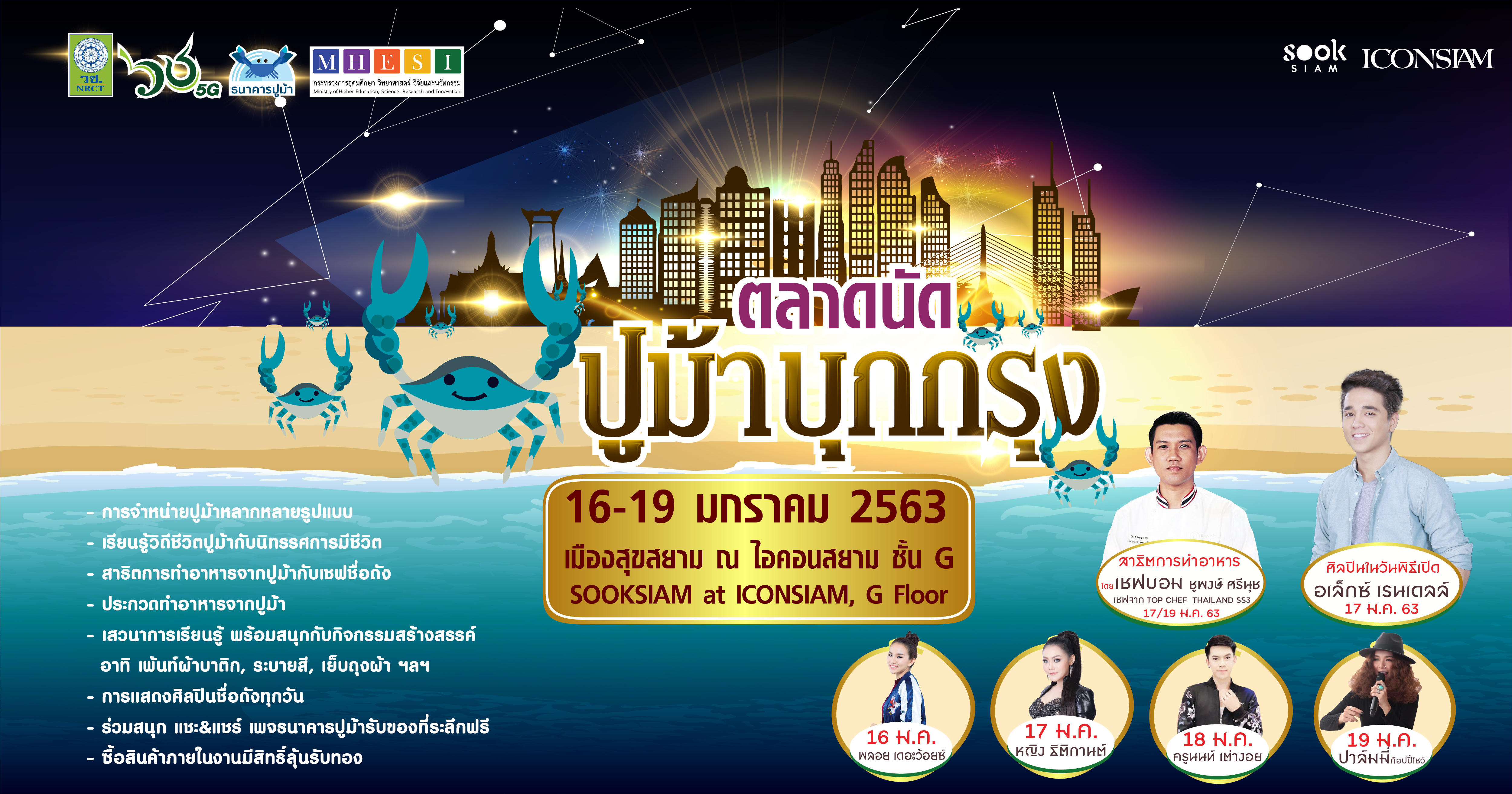 16 มกราคม 2563 - 19 มกราคม 2563เชิญร่วม งานตลาดนัดปูม้าบุกกรุง จัดโดย สำนักงานการวิจัยแห่งชาติ (วช.) ที่เมืองสุขสยาม ณ ไอคอนสยาม ชั้น G ตั้งแต่วันที่ 16 - 19 มกราคม 2563 เวลา 10.00 - 22.00 น. เป็นต้นไป ภายในงานขนทัพสินค้าผลิตภัณฑ์ปูม้า จากเกษตรกรเจ้าของผลิตภัณฑ์กว่า 15 ร้านให้คุณได้เลือกชม ชิม ช้อป กันอย่างจุใจ และกิจกรรมอื่นๆ อาทิ วันศุกร์ที่ 17 มกราคม 2563 เวลา 17.00 น. เป็นต้นไป ร่วมพิธีเปิดงานอย่างเป็นทางการ ร่วมพูดคุยกับนักแสดงหนุ่มตัวแทนด้านการอนุรักษ์สิ่งแวดล้อม อเล็กซ์ เรนเดลล์ และสนุกกับมินิคอนเสิร์ตจาก หญิง ธิติกานต์ สาธิตการทำงานอาหารจากเชฟบอม ชูพงศ์ จากรายการ TOP Chef Thailand Season 3 การแสดงฟรีมินิคอนเสิร์ตโดยศิลปินมากความสามารถตลอดวันจัดงาน อาทิ พลอย The Voice, ปาล์มมี่ ก๊อปปี้โชว์, นนท์ อรัญ และกิจกรรมประกวดทำอาหารข้าวผัดปูและยำปูม้า ชิงเงินรางวัลรวมมูลค่ากว่า 3,000 บาท การเสวนาให้ความรู้ธนาคารปูม้าจากผู้เชี่ยวชาญพร้อมกิจกรรมเชิงปฎิบัติการ นิทรรศการให้ความรู้เกี่ยววงจรชีวิตของปูม้า ธนาคารปูม้าและพบกับโมเดลปูม้าขนาดใหญ่ การจำหน่ายสินค้าจากวัตถุดิบ ผลิตภัณฑ์จากปูม้าสดๆจากเจ้าของผลิตภัณฑ์โดยตรง