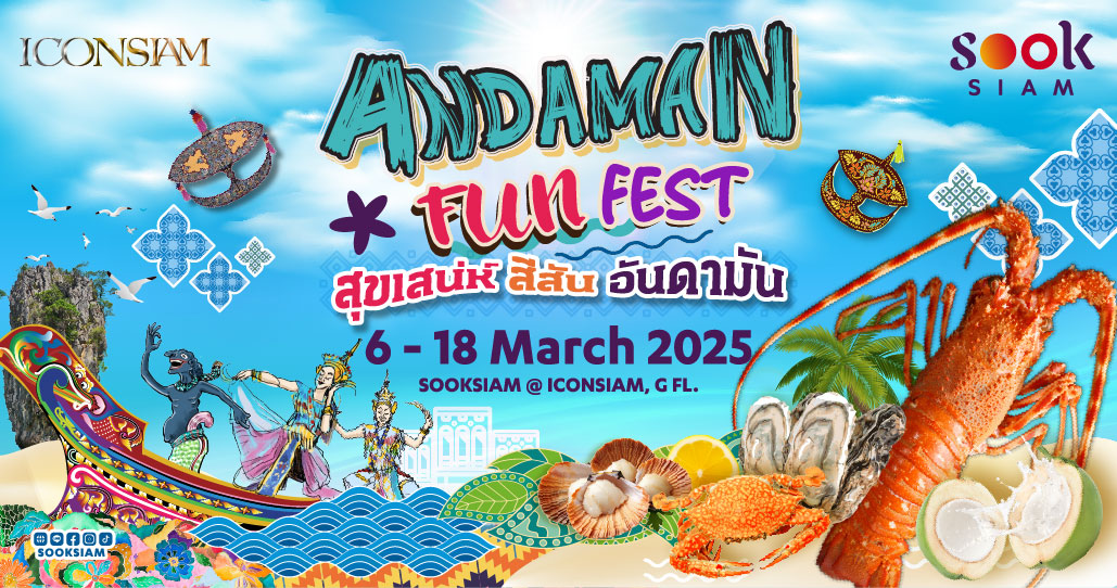6 มีนาคม 2568 - 18 มีนาคม 2568ที่สุดแห่งความอร่อยและเสน่ห์อันเป็นเอกลักษณ์ของแดนใต้ 'สุขเสน่ห์ สีสัน อันดามัน' ชวนทุกท่านมาอิ่มอร่อยกับเมนูอาหารทะเลสด ๆ หลากหลายเมนู พร้อมเครื่องดื่มเย็นๆ ชื่นใจ และการแสดงแสง สี เสียง อย่างครนครัน . ปักหมุดมาเลยในงาน Andaman Fun Fest วันที่ 6 – 18 มี.ค. 68 ที่เมืองสุขสยาม ณ ไอคอนสยาม ชั้น G