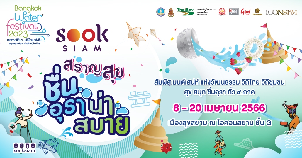 1 เมษายน 2567 - 18 เมษายน 2567เมืองสุขสยาม ณ ไอคอนสยามร่วมกับ กระทรวงวัฒนธรรม, การท่องเที่ยวแห่งประเทศไทย (ททท.), Water Festival 2024 บริษัท ไทยเบฟเวอเรจ จำกัด (มหาชน) บริษัท ประชารัฐรักสามัคคี วิสาหกิจ เพื่อสังคม (ประเทศไทย) จำกัด, ธนาคารกสิกรไทย จำกัด (มหาชน), บริษัท ไทย อกริ ฟู้ดส์ จำกัด (มหาชน), บริษัท ไทยเทพรส จำกัด (มหาชน) บริษัท ห้าตะขาบ (ซิมเทียนฮ้อ) จำกัด กลุ่มบริษัทอังกฤษตรางู และบริษัท เนกซ์สเตป จำกัด ร่วมจัดงาน “สุขสยามอัศจรรย์ เย็นฉ่ำ ชื่นใจ” ภายใต้แนวคิด “เสน่ห์ความสุข สนุกแบบไทย ที่คนทั้งโลกต่างหลงรัก” ภายในงานจัดเตรียมกิจกรรมเพื่อให้ทุกท่าน ได้สัมผัสเสน่ห์ของวัฒนธรรมไทย และหลงรัก ในวัฒนธรรมไทยมากมาย #sookสนุก สาดความสุข ฉ่ำเย็น ชื่นใจ ภายใต้อุโมงค์น้ำสายรุ้งยาวกว่า 20 เมตร ประกอบ แสง สี เสียง ตลอดการจัดงาน #sookสมหวัง เสริมสิริมงคลสรงน้ำพระพุทธรูป 5 สมัย และพระพุทธรูปประจำวันเกิด ประดิษฐาน ณ บริเวณประตูสุขสุวรรณศาลา #sookเสน่ห์ จัดเต็มอย่างสนุกกับศิลปวัฒนธรรม 4 ภาค ต้อนรับปีใหม่ไทยอย่างมีความสุข และใน วันที่ 12 เม.ย. 67 เตรียมชมขบวน ตามโบราณประเพณี ขบวนแห่นางสงกรานต์ “มโหธรเทวี” #sookสัมพันธ์ วันที่ 12 เม.ย. เวลา 15.00 น. ร่วมประเพณีไทยอันดีงาม รดน้ำขอพรผู้ใหญ่ เป็นสิริมงคลของชีวิต #sookสมหวัง วันที่ 13 เม.ย. เวลา 12.00 น. เมืองสุขสยามร่วมกับชุมชนท่าวัด, กรมเจ้าท่า และหน่วยงานเอกชน เปิดงานเทศกาลแห่พระทางน้ำ ล่องไปยังท่าวัดต่างๆ เพื่ออัญเชิญ พระพุทธรูป ประดิษฐานทั้ง 5 ท่าวัด #sookสร้างสรรค์ ชมการสาธิตหัตถกรรมขนมไทย พร้อมร่วมกิจกรรม Workshop ตามวิถีชุมชน 4 ภาค #sookแซ่บ กับอาหารแนว Street Food จากผู้ประกอบการร้านอาหารชั้นนำ ทั่วไทยทั้ง 4 ภาค พร้อมร่วมช้อปสินค้าชุมชนจากประชารัฐรักสามัคคี สร้างเศรษฐกิจอย่างยั่งยืนครบจบในที่เดียว ทั้งหมดในงาน สุขสยาม อัศจรรย์ เย็นฉ่ำ ชื่นใจ วันนี้ - 18 เม.ย. 67 เมืองสุขสยาม ณ ไอคอนสยาม ชั้น G