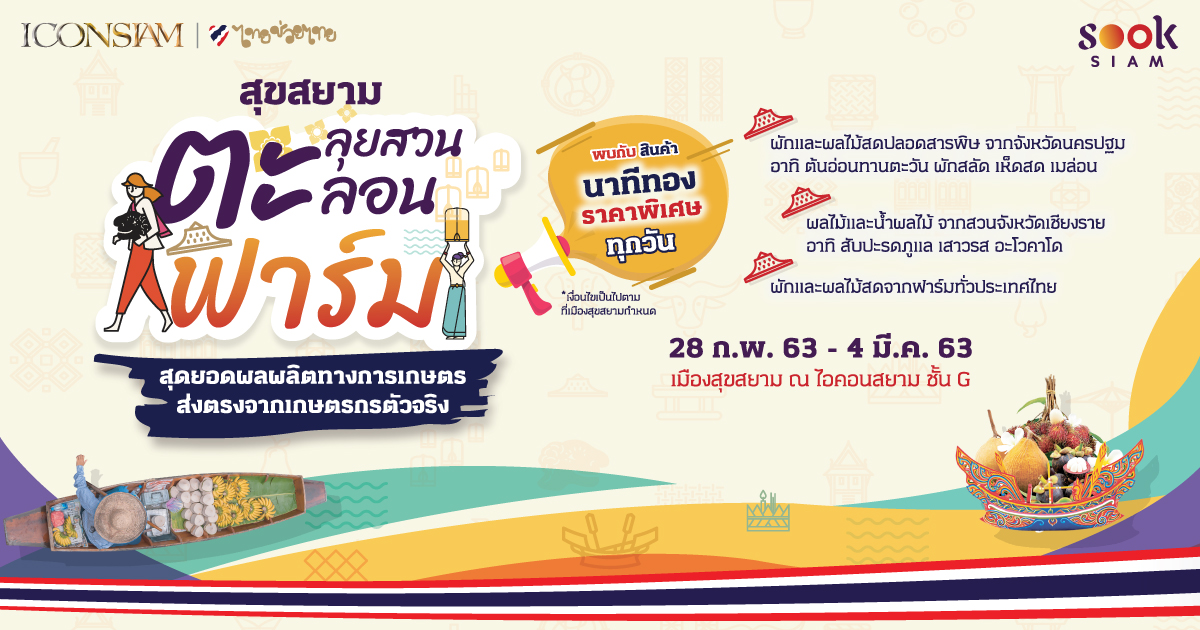 28 กุมภาพันธ์ 2563 - 6 มีนาคม 2563รวมพลังชาวไทย ช่วยเหลือเกษตรกรไทย ในงาน สุขสยาม ตะลุยสวน ตะลอนฟาร์ม พบกับสุดยอดผลผลิตทางการเกษตร ส่งตรงจากเกษตรกรตัวจริง ยกสวนมาให้เลือกซื้อทั้งผัก - ผลไม้ และผลิตภัณฑ์แปรรูปทางการเกษตรต่างๆ ส่งตรงจากฟาร์มทั่วไทย มาสู่เมืองกรุง ในราคามิตรภาพ - ลานเมือง 1 : เนรมิตกลุ่มสินค้าผลิตผลทางการเกษตร ทั้งสดและแปรรูป อาทิ ผัก - ผลไม้ ปลอดสารพิษ, น้ำสมุนไพร, น้ำผลไม้สด, ผลิตภัณฑ์แปรรูปจากผักและผลไม้ ส่งตรงจากสวนทั่วประเทศไทย - ลานเมือง 2 : กลุ่มสินค้าขนม ของฝาก ของที่ระลึกจากโซนสุขสยาม พลาซ่า และสินค้านาทีทอง ลดราคาพิเศษแบบจุใจ ตั้งแต่วันที่ 28 กุมภาพันธ์ - 6 มีนาคม 2563 ที่ลานเมือง เมืองสุขสยาม ณ ไอคอนสยาม ชั้น G