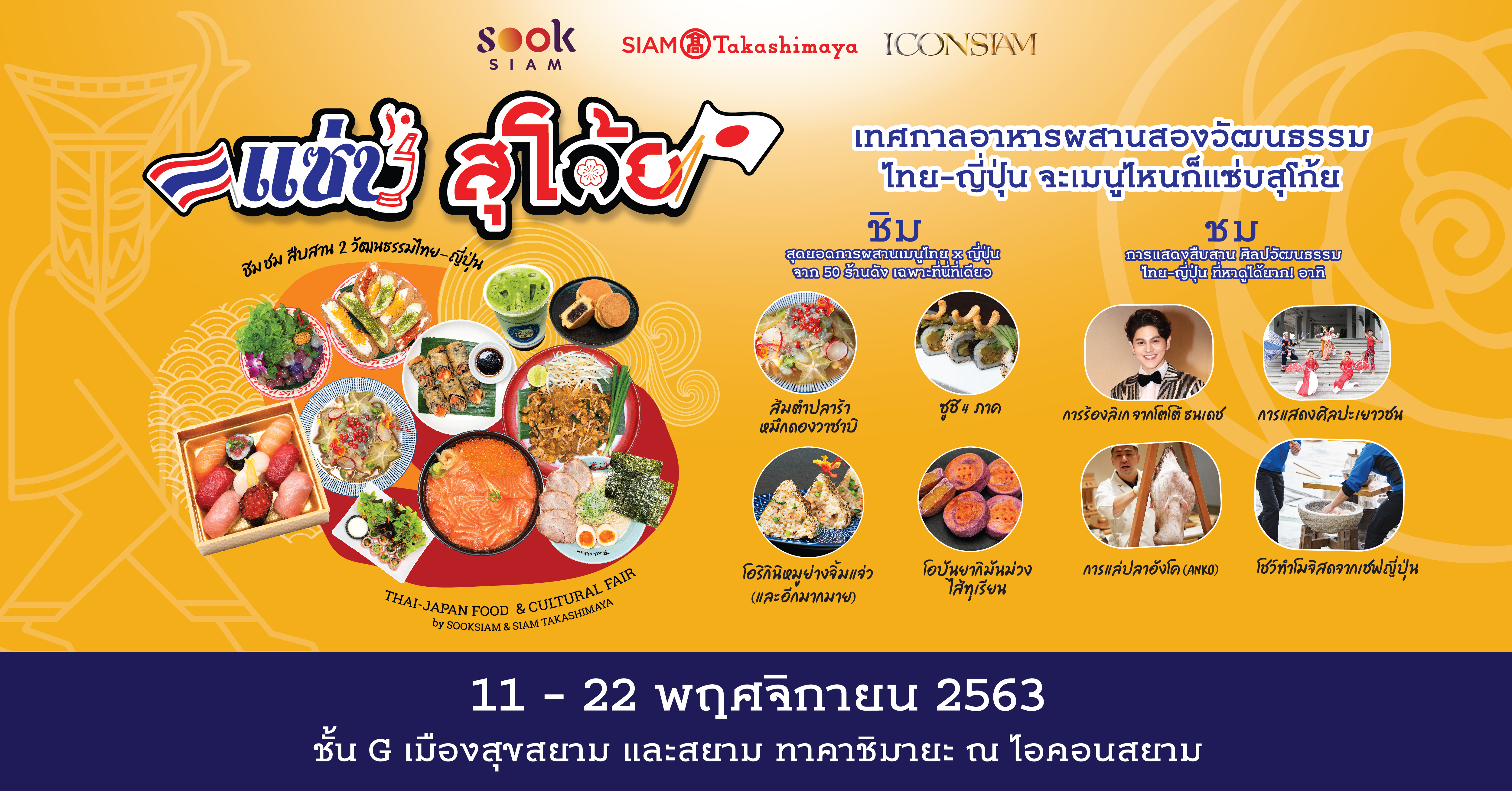 11 พฤศจิกายน 2563 - 22 พฤศจิกายน 2563ได้เวลา #สุขแซ่บ แบบไทย X ญี่ปุ่น ลิ้มรสความอร่อย ในงาน “แซ่บ สุโก้ย” Zaab Sugoi Thai-Japan Food & Cultural Fair” เทศกาลอาหารผสานสองวัฒนธรรมไทยและญี่ปุ่น วันที่ 11 พ.ย. 2563 – 22 พ.ย. 2563 ที่เมืองสุขสยาม และห้างสยาม ทาคาชิมายะ ชั้น G ไอคอนสยาม ฉลองครบ 2 ปี เมืองสุขสยาม เมืองสารพัดสุข สนุกแบบไทย ร่วมกับ สยาม ทาคาชิมายะ ห้างสรรพสินค้าญี่ปุ่นขนานแท้แห่งเดียวในประเทศไทย ชวนทุกท่านมาสัมผัสประสบการณ์ชิม ชม สืบสาน วัฒนธรรมไทย -ญี่ปุ่น พร้อม #สุขแซ่บ กับจานเด็ดเมนูประจำชาติไทย ที่ผสานความอร่อยแบบสุโก้ยด้วยวัตถุดิบเลื่องชื่อจากญี่ปุ่นรังสรรค์เป็นพิเศษเฉพาะงานนี้ อาทิ ส้มตำหมึกดองวาซาบิ, ซูชิ 4 ภาค, โอนิกิริหมูย่างแจ่วบอง, โอบังยากิมันม่วงไส้ทุเรียน, ราเม็งแกงเขียวหวาน, ปอเปี๊ยะไส้แกงกระหรี่ ฯลฯ พบกับร้านอาหารชื่อดังกว่า 50 ร้านค้าที่มาออกร้านเสิร์ฟความอร่อย ชิมเมนู #สุขแซ่บ กับอาหารไทย 4 ภาค จากร้านอาหารภายในเมืองสุขสยาม อาทิ ยำซีฟู้ด ยำแซลมอน ลาบแซลมอน เนื้อย่าง จากร้าน E-Sarn, ผัดไทยโบราณ เปาะเปี๊ยะไส้แกงกะหรี่ไก่ จากร้าน ผัดไทยอารีย์, ส้มตำปลาร้าหมึกดองวาซิบิ โอริกินิหมูย่างจิ้มแจ่ว จากร้านภูไทไก่ย่าง, ชุดแหนมเนือง ขนมปังปาเต๊ะ และอาหารเวียดนาม จากร้าน Siam แหนมเนือง เป็นต้น ช้อปวัตถุดิบพรีเมียม - เมนูอาหารร้านดังราคาพิเศษ อาทิ เนื้อริบอายวากิว A4 จากร้าน Sugimoto ขนาด 100 กรัม ปกติ 1,000 บาท ราคาพิเศษเพียง 700 บาท และเนื้อวากิวสเต๊ก A4 ขนาด 150 กรัม ปกติ 750 บาท ราคาพิเศษ 500 บาท, เมนู SALMON 4 OCEAN DON ปกติราคา 549 ลดพิเศษเหลือเพียง 499 บาทจากร้าน Omakase Don, เลม่อนชีสทาร์ตจากร้าน Gokoku ราคาปกติ 145 บาท ลดพิเศษ 95 บาท และโปรโมชั่นจากร้านค้าอื่นๆ อีกมากมาย ชมเพลินตา #สุขสนุกเพลินใจ พบกับการแสดงเพื่อสืบสานวัฒนธรรมไทย - ญี่ปุ่นที่หาดูได้ยาก ทุกวันเสาร์-อาทิตย์ และร่วมเล่นเกมชิงรางวัล อาทิ - เวิร์กชอปการพับกระดาษโอริกามิ 3 มิติ โดย คุณเอกสิทธิ์ เข้มงวด ศิลปินนักพับกระดาษมือหนึ่งของเมืองไทย - ชมการแล่ปลา Maguro จากร้าน Nakajima Suisan, การแล่ปลา Anko (อังโค) จากร้าน Masa Sushi – โชว์ทำโมจิสดจากเชฟญี่ปุ่น – การแสดงฟ้อนหางนกยูง - วันเสาร์ที่ 14 พฤศจิกายน 2563 มินิคอนเสิร์ตจากพระเอกลิเกสุดฮอต โตโต้ ธนเดช ฯลฯ - กิจกรรม Food Journey* ร่วมสนุกได้ตั้งแต่ 11 - 22 พ.ย. 63 เวลา 10.00 – 21.00 น. (จำกัดจำนวน 600 สิทธิ์ตลอดรายการ) *ติดตามรายละเอียดทาง Facebook : SOOKSIAM และ Facebook : Siam Takashimaya