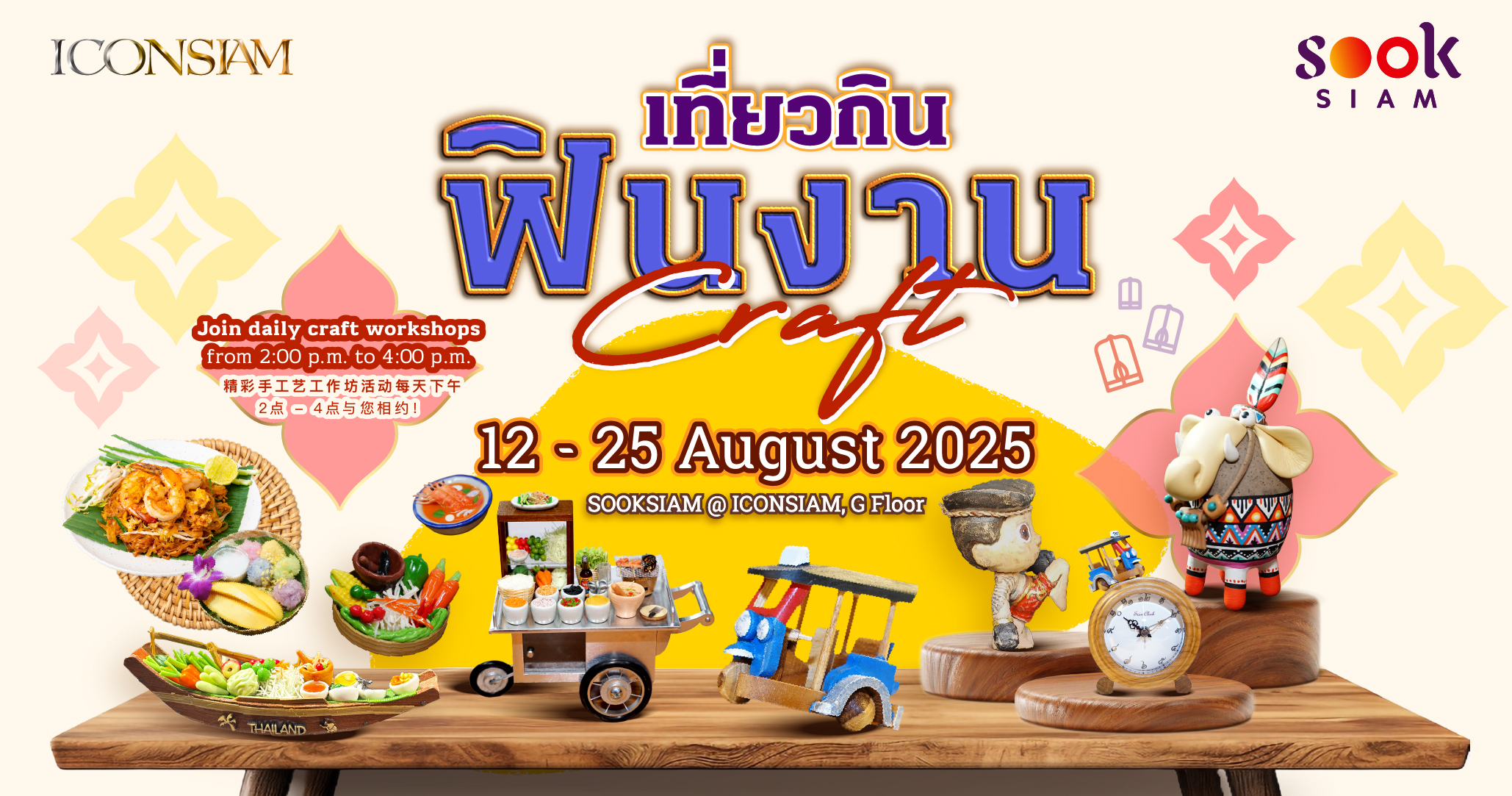 12 สิงหาคม 2568 - 25 สิงหาคม 2568เที่ยวกิน ฟินงานคราฟท์! ดื่มด่ำเสน่ห์ หัตถกรรม จาก 4 ร้านดัง พร้อมเวิร์กชอปให้ลงมือทำเอง และอิ่มฟินกับสตรีทฟู้ด 4 ภาค . Little Farm Sook – งานปั้นดินไทยผสมกากกาแฟ ดินไทยจากชุมชน จ.ขอนแก่น ผสมกากกาแฟ ได้โทนสีน้ำตาลธรรมชาติ เบา แข็งแรง ไม่แตกง่าย . เมี่ยว เมี่ยว – ปั้นจิ๋ว ดินญี่ปุ่น งานจิ๋วแต่วิถีไทยเต็มเปี่ยม ทั้งดอกไม้ กล้วยไม้ ผัก ผลไม้ และวัตถุดิบอาหารไทย จัดวางอย่างวิจิตรในพาน ดินญี่ปุ่นเนื้อละเอียด ยืดหยุ่น ลงสีได้หลากสไตล์ . Xun Siamclock – นาฬิกาไม้สักแกะสลัก ฝีมือชุมชนกรุงเทพฯ วัสดุคุณภาพ พร้อมลวดลายเอกลักษณ์ไทยอย่างเสาชิงช้าและรถตุ๊กตุ๊ก . ตุ๊กตาไม้นายโถ ตุ๊กตาไม้จากไม้ท้องถิ่นจาก จ.เชียงใหม่ ดีไซน์น่ารัก แรงบันดาลใจจากสัตว์เลี้ยงและวัฒนธรรมไทย พบกับกิจกรรม Workshop ทุกวัน เวลา 14.00 - 16.00 น. สนุกเพลิดเพลินกับงานคราฟท์หลากสไตล์ ฟรี!* . พบกันที่งาน "เที่ยวกิน ฟินงานคราฟท์" 12 – 25 ส.ค. 68 เมืองสุขสยาม ณ ไอคอนสยาม ชั้น G