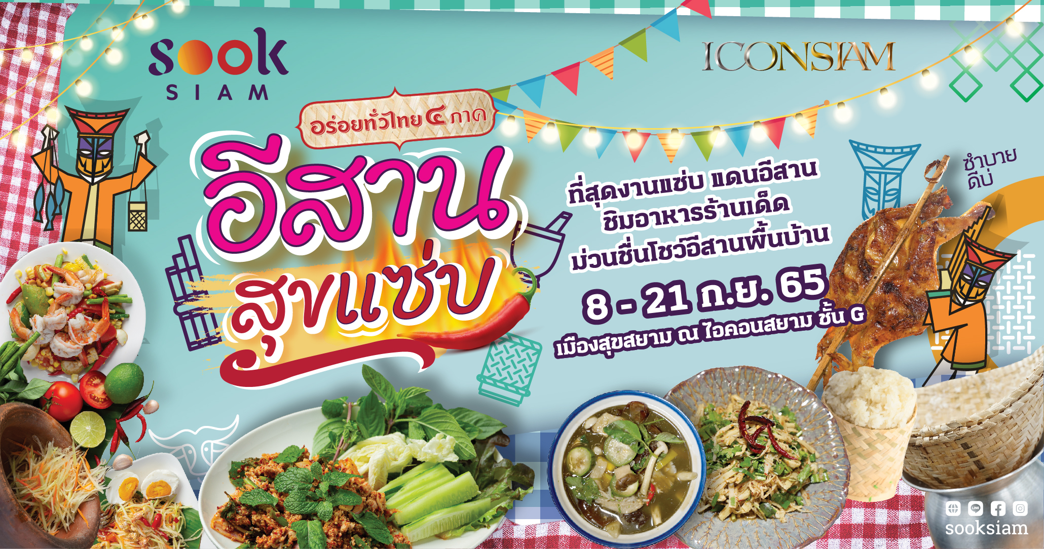 8 กันยายน 2565 - 21 กันยายน 2565#สุขสยาม ส่งต่อความอร่อยจากหรอยแรงปักษ์ใต้ สู่ #อีสานสุขแซ่บ ที่สุดงานแซ่บแดนอีสาน ชิมอาหารรสเด็ด ม่วนซื่นโชว์อีสานพื้นบ้าน งานที่รวมอาหารอร่อยพื้นถิ่นแท้ๆ สัมผัสเสน่ห์แดนอีสาน ที่คัดสรรมารวมไว้ อาทิ “ส้มตำ ไก่ย่าง ข้าวเหนียว” “พร้อมน้ำพริก ผักต้ม แกงอ่อม ซุปหน่อไม้””จิ้มจุ่ม แจ่วฮ้อน”“ปลานึ่ง-ปลาย่าง” สารพัดเมนูยำ และเมนูสุขสุดแซ่บอีกมากมาย ม่วนกับการแสดงอีสานลำเพลิน,หมอแคน เซิ้งกันแบบสนุกสนานสไตล์อีสาน ตื่นเต้นไปกับโชว์ส้มตำลีลาสุดแซ่บ พิเศษ โปรโมชั่นอีสานสุขแซ่บ เมื่อซื้อเมนูอาหารจุ่มดาดย่างเนย จิ้มจุ่ม จากร้าน E-Sarn (Evaime Shabu Shabu) ครบ 500 บาท และชำระผ่าบัตรเครดิต/เดบิตกสิกรไทย หรือสแกนจ่ายผ่าน App KPlus หรือ QR Code ปิ๊บจังของธนาคารกสิกรไทย รับฟรี ชุดปลูกต้นไม้ D.I.Y 1 ชุด มาม่วนซื่นไปด้วยกัน ในงานอาหารทั่วไทย4ภาค “อีสานสุขแซ่บ” ตั้งแต่วันที่ 8-21 กันยายน 2565 เมืองสุขสยาม ณ ไอคอนสยาม ชั้น G #อาหารทั่วไทย4ภาค #อีสานสุขแซ่บ #เมืองสารพัดสุขสนุกแบบไทย #สุขสยาม #ไอคอนสยาม #ICONSIAM #SOOKSIAM