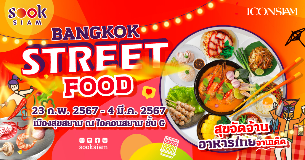 22 กุมภาพันธ์ 2568 - 5 มีนาคม 2568พบกับความฟินกับสุดยอด Street Food จาก 4 ภาคทั่วไทย! เอาใจสายกินที่หลงใหลในความสุขของรสชาติ กับเมนูคาวหวานสุดอร่อยจากทุกภูมิภาคในเมืองไทย คัดสรรเมนูฮิต เมนูเด็ด เมนูดัง มาให้ลิ้มลองแบบไม่ซ้ำใคร! . ขอเชิญสายกินทั่วประเทศ มาฟินกับเมนูเด็ดจาก Street food มากมาย ในงาน “Bangkok Street Food” 22 ก.พ. - 5 มี.ค. 68 เมืองสุขสยาม ณ ไอคอนสยาม ชั้น G SOOKSIAM @ ICONSIAM, G fl. *เวลาอาจมีการเปลี่ยนแปลงหน้างานตามความเหมาะสม *เงื่อนไขเป็นไปตามที่บริษัทกำหนด