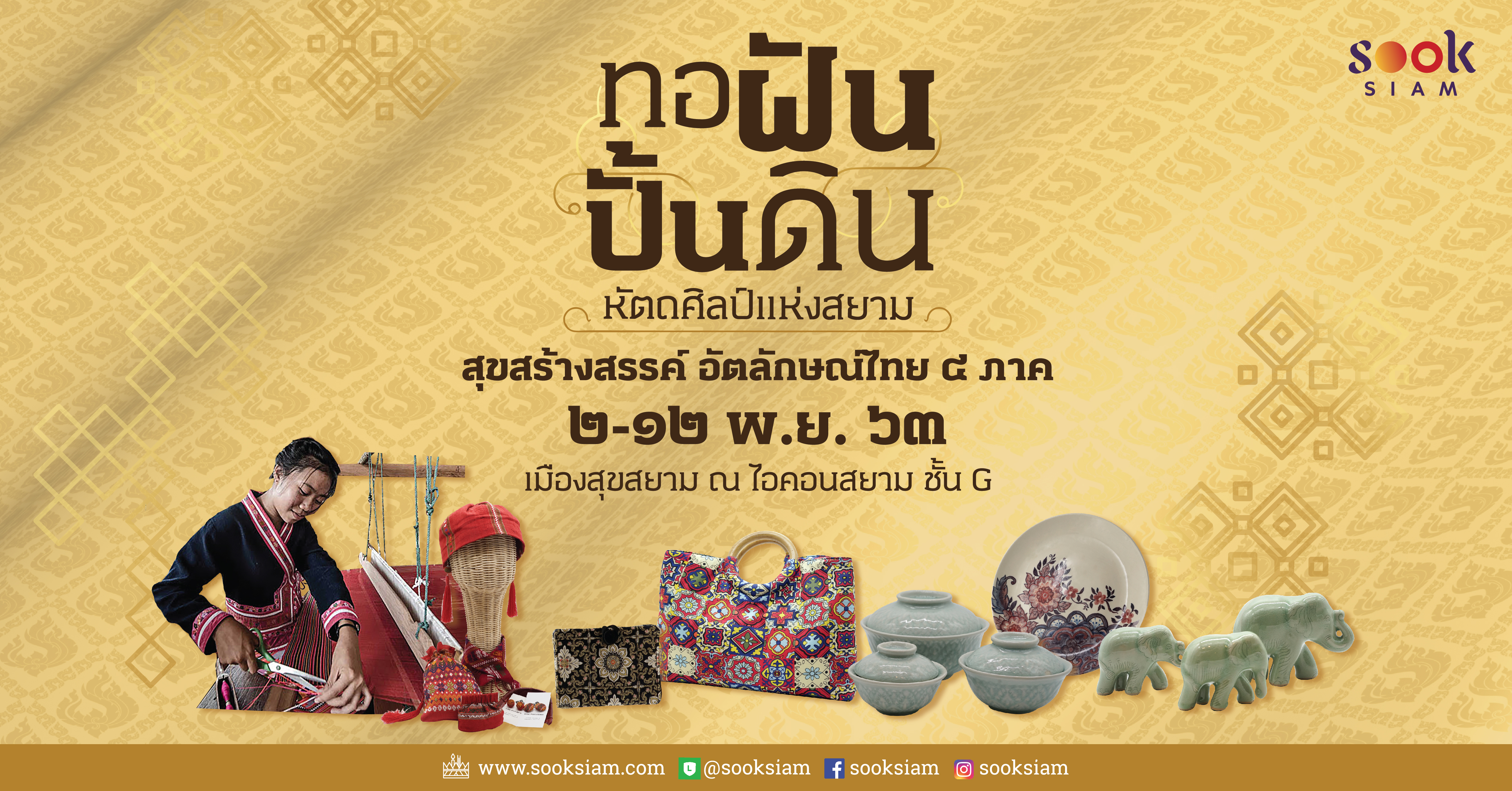 2 พฤศจิกายน 2563 - 12 พฤศจิกายน 2563ร่วมสานฝัน ต่อยอด และสนับสนุนช่างฝีมือลือชื่อของไทย ในงาน “ทอฝัน ปั้นดิน หัตถศิลป์แห่งสยาม” สุขสร้างสรรค์ อัตลักษณ์ไทย 4 ภาค กับสินค้าหัตถศิลป์น่าใช้ ทั้งผ้าทอ ผ้าไทย เครื่องปั้นดินเผา และผลิตภัณฑ์เซรามิค ด้วยการ Co-Creation จากแรงบัลดาลใจของคนรุ่นใหม่ ที่ต้องการสืบสานมรดกจากศิลปวัฒนธรรมไทยให้คงอยู่ และมีดีไซน์โดดเด่น ทันยุคทันสมัย สามารถสวมใส่และนำมาใช้ได้ในชีวิตประจำวัน พร้อมสินค้าที่คัดสรรมาแล้วว่าเป็นผลงานชิ้นเอก ระดับ Masterpiece ที่รับรองว่าถูกตา ต้องใจผู้ที่ชื่นชอบงานศิลปะร่วมสมัยอย่างแน่นอน นำโดย - ผ้าไหมแพรวา “ราชินีแห่งผ้าไหม” จาก “รักษ์แพรวา จ.กาฬสินธุ์” นำผ้าไหมที่เป็นเอกลักษณ์ของชาวภูไท ภาคอีสาน มาดีไซน์ให้มีลวดลายการทอ และสีสันที่สวยงามโดดเด่น และพัฒนาไปเป็นเสื้อผ้า เครื่องนุ่งห่ม และเครื่องประดับเก๋ๆ อย่าง ผ้าคลุมไหล่, กระเป๋าย่าม กระเป๋าสะพาย, หมวก, สร้อยคอ ต่างหู - ผ้าปาเต๊ะเพ้นท์ลาย หรือผ้าปาเต๊ะปักลูกปัด จาก “South Fabric จ.ภูเก็ต” ผ้าพื้นเมืองที่ถ่ายทอดอัตลักษณ์ ของชาวปักษ์ใต้ ด้วยลวดลายที่โดดเด่น สะดุดตา ประณีตสวยงาม เป็นงานดีไซน์ที่ไม่ซ้ำใคร เรียกได้ว่าเป็นชิ้นเดียวในโลก เมื่อนำมาผสานกับการออกแบบให้ทันสมัย เก๋ไก๋ ยิ่งขับให้การแต่งกายของคุณหรูหรา และมีสไตล์ยิ่งขึ้น - เครื่องปั้นดินเผา จาก “เชียงใหม่ ศิลาดล จ.เชียงใหม่” อนุรักษ์ความงามของศิลปะสมัยสุโขทัยไว้ และมีการผลิตอย่างต่อเนื่องมานานกว่า 70 ปี มีจุดเด่น คือ เน้นการทำมือ ยึดวัฒนธรรมการผลิตดั้งเดิม ทำให้ชิ้นงานที่ได้มีความเป็นเอกลักษณ์แตกต่างกันไปในแต่ละชิ้น สินค้ามีสีเขียวหยก ผิวเคลือบที่ได้แตกลายงา (cracking) ผลิตภัณฑ์เซรามิค - ผลิตภัณฑ์เซรามิค “CVB Ceramic จ.นครปฐม” ที่ส่งต่อกิจการจากรุ่นสู่รุ่น จากเซรามิครูปแบบดั้งเดิม นำมาพัฒนาต่อยอด สร้างสรรค์ลวดลายใหม่ๆ จนได้ ผลิตภัณฑ์เซรามิค อาทิ อ่างล้างมือ แจกัน จาน-ชาม ที่สวยงาม ด้วยลวดลายที่สื่อถึงศิลปวัฒนธรรม วิถีชีวิตความเป็นอยู่ของไทยได้อย่างลงตัว #สุขแซ่บ กับอาหารเลื่องชื่อจากชุมชนต่างๆ ทั่วไทย ที่มาร่วมสร้างสรรค์ความอร่อยให้แก่เหล่านักชิม อาทิ ข้าวแช่ชาววัง, ครองแครงกรอบ, ยำวุ้นเส้นโบราณ - ยำปลาสลิด, ข้าวเหนียวทุเรียน ข้าวเหนียวมะม่วง, น้ำเต้าหู้ เต้าฮวย จากดาหลา เจ้าเก่าตลาดสมเด็จ, ก๋วยเตี๋ยวไก่รสเด็ด เป็นต้น รับฟรี! Workshop ปั้นของจิ๋ว มูลค่า 250 บาท เมื่อซื้อสินค้าจากร้านค้าภายในงานครบ 500 บาทขึ้นไป (เฉพาะร้านค้าในลานเมือง 1) *สามารถรวมใบเสร็จได้, จำกัด 1 สิทธิ์ / ท่าน /