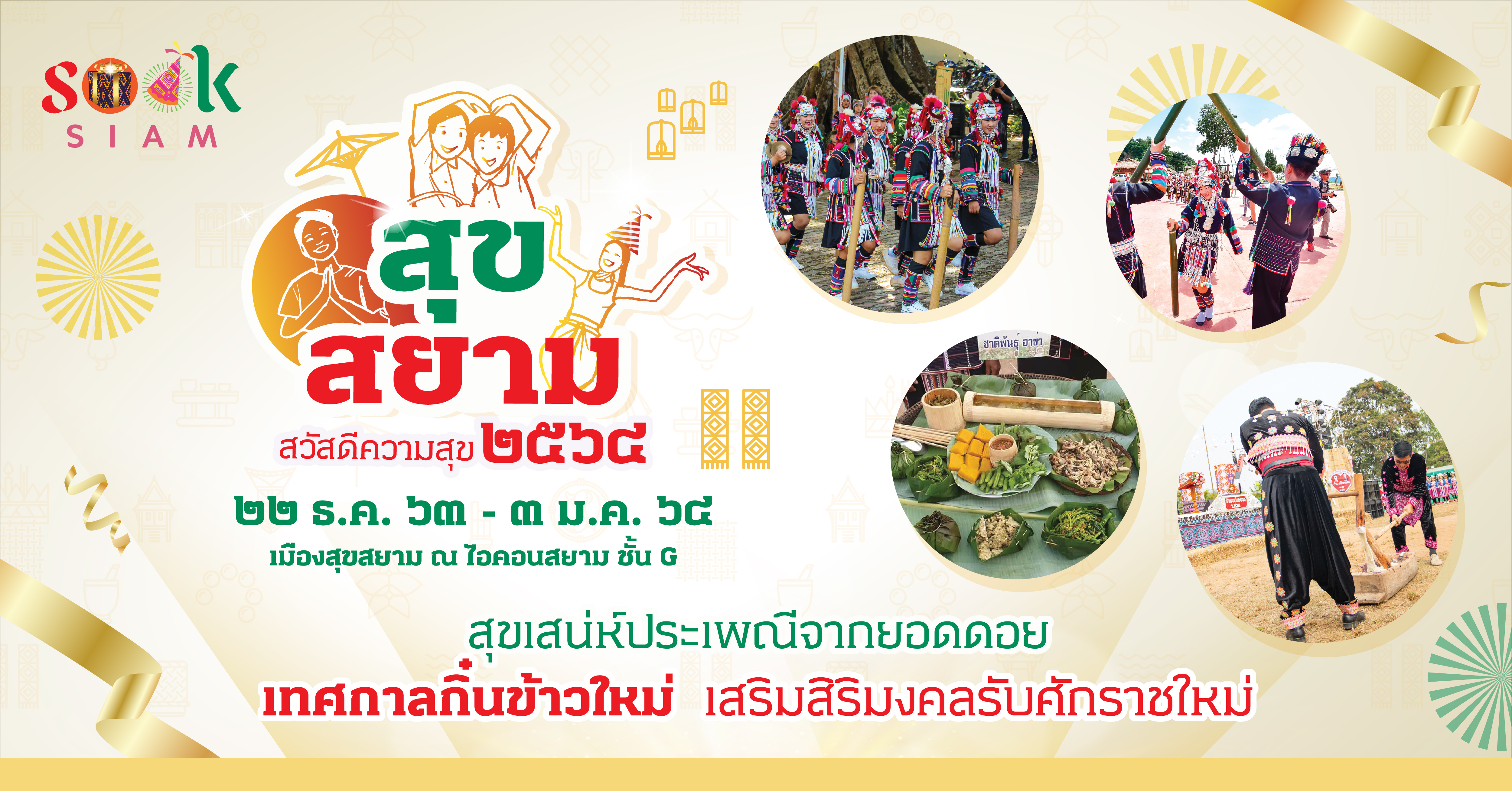 22 ธันวาคม 2563 - 3 มกราคม 2564สุขสยาม สวัสดีความสุข ๒๕๖๔ วันนี้ ถึง ๓ มกราคม ๖๔ ที่เมืองสุขสยาม ณ ไอคอนสยาม ชั้น G เนรมิตเมืองของขวัญ ช้อปกระเช้าส่งความสุข และของฝากทั่วไทย พร้อมสืบสานประเพณี ปีใหม่ล้านนา “กิ๋นข้าวใหม่” ให้สุขสมหวังตลอดปี ส่งท้ายปีเก่าต้อนรับปีใหม่ ที่เมืองสุขสยาม ณ ไอคอนสยาม ชั้น G ส่งต่อความสุขด้วยการคัดสรรของดีทั่วภูมิภาค พร้อมจำหน่ายผลิตภัณฑ์ของขวัญของฝากจากทั่วไทย นำมาจัดกระเช้าสารพัดความสุข ร้อยเรียงเรื่องราวผลิตภัณฑ์ความภาคภูมิใจของคนไทย เพื่อมอบให้แก่คนที่คุณรัก #สุขเสน่ห์ กับ กิจกรรมบริเวณลานเมือง จำลองบรรยากาศประเพณีปีใหม่ล้านนากับเทศกาล “กิ๋นข้าวใหม่” ความเชื่อของชาวล้านนาในการทานข้าวใหม่ เพื่อความเจริญรุ่งเรืองรับปีใหม่และข้าวธัญพืชจากชนเผ่า สื่อถึงความงอกเงย งอกงาม และการแสดงวิถีถิ่นที่สืบทอดกันมายาวนาน อาทิ การเต้นจะคึ ของชาวลาหู่ การเต้นรำตามประเพณีในช่วงวันปีใหม่ของชนเผ่า เพื่อบวงสรวงสิ่งศักดิ์สิทธิ์ในพิธีกรรมสำคัญ, เต้นกระทุ้งกระบอกไม้ไผ่ ของชนเผ่าอาข่า เป็นต้น